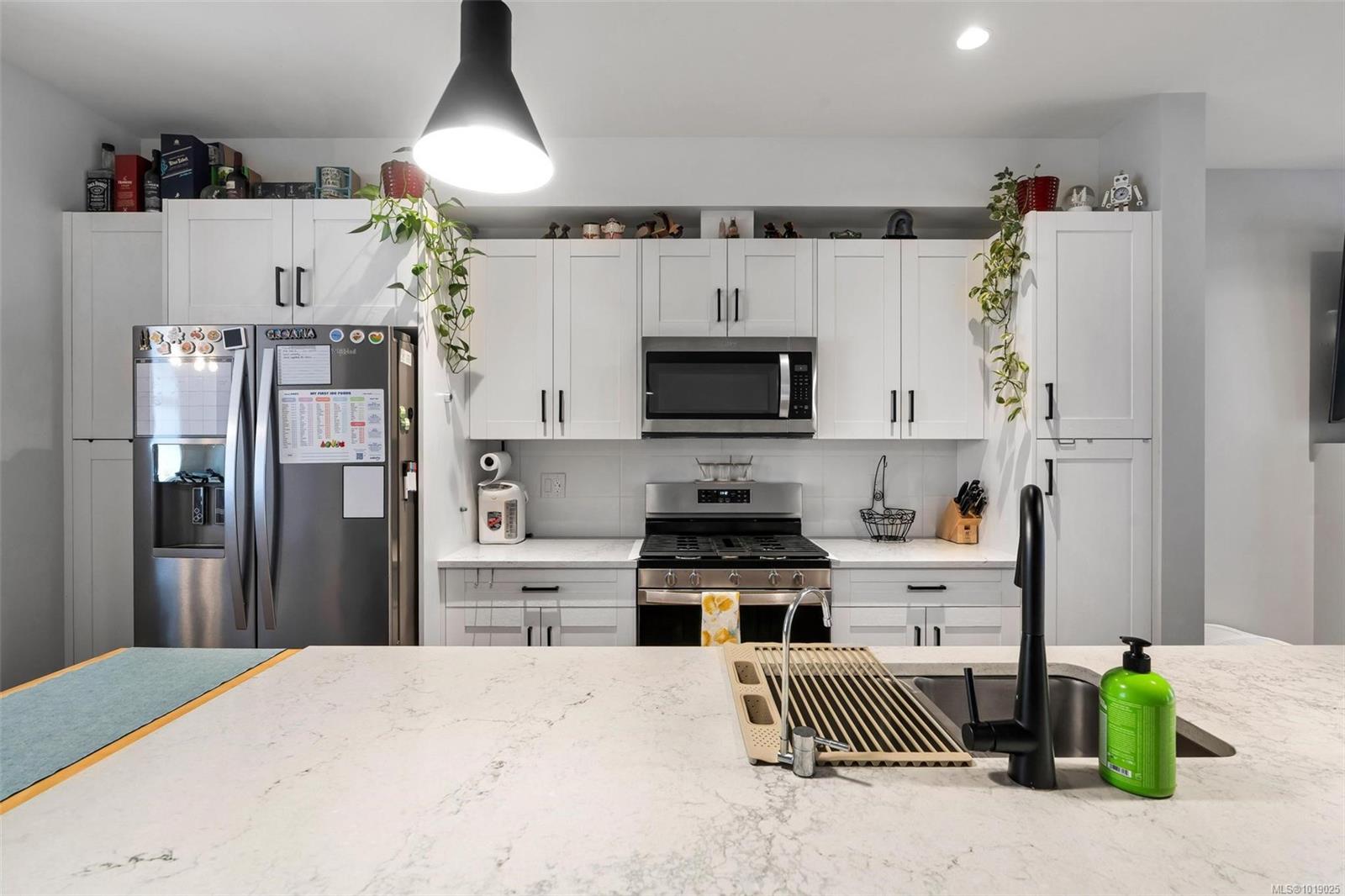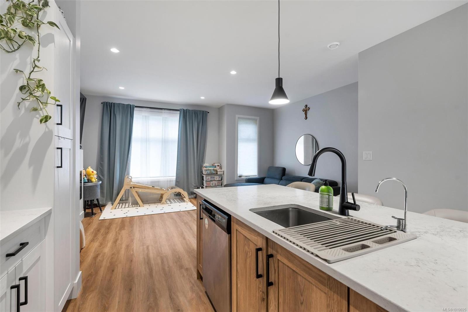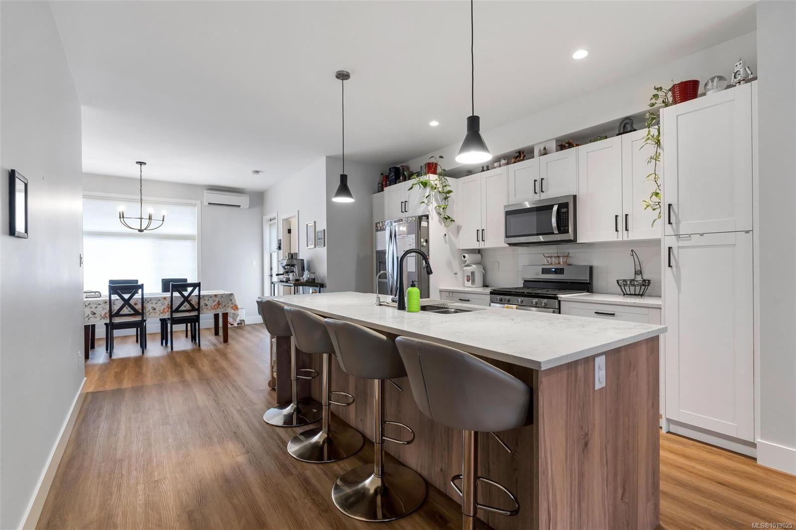 The best floor plan currently available in this strata. Beautiful 2000+ sqft property has 3 bedrooms on the top floor, 3 bathrooms throughout and a massive 497 sq ft double garage. The open concept floor plan features a chef's kitchen in the heart of the room with stainless appliances including a gas range, soft close drawers, floor to ceiling pantry, tile backsplash, and massive island that sits between the living and dining rooms. The home has 9ft ceilings, AC, On demand hot water, and quartz countertops throughout. A fully fenced backyard, sunny and with a gas bbq or gas heater bib is accessed directly off the dining room. The primary bedroom has a four piece ensuite and a walk-in closet. This property offers everything you’ll want and is located in an accessible area close to Red Barn Market, Olympic View golf course, The Beachlands, the Galloping Goose! Remainder of 2-5-10 year warranty. Two pets no weight restrictions and rentals allowed. Essentially still new and with low strata fees, this listing is a winner that deserves your attention if the West Shore lifestyle in this idyllic location is calling you.
