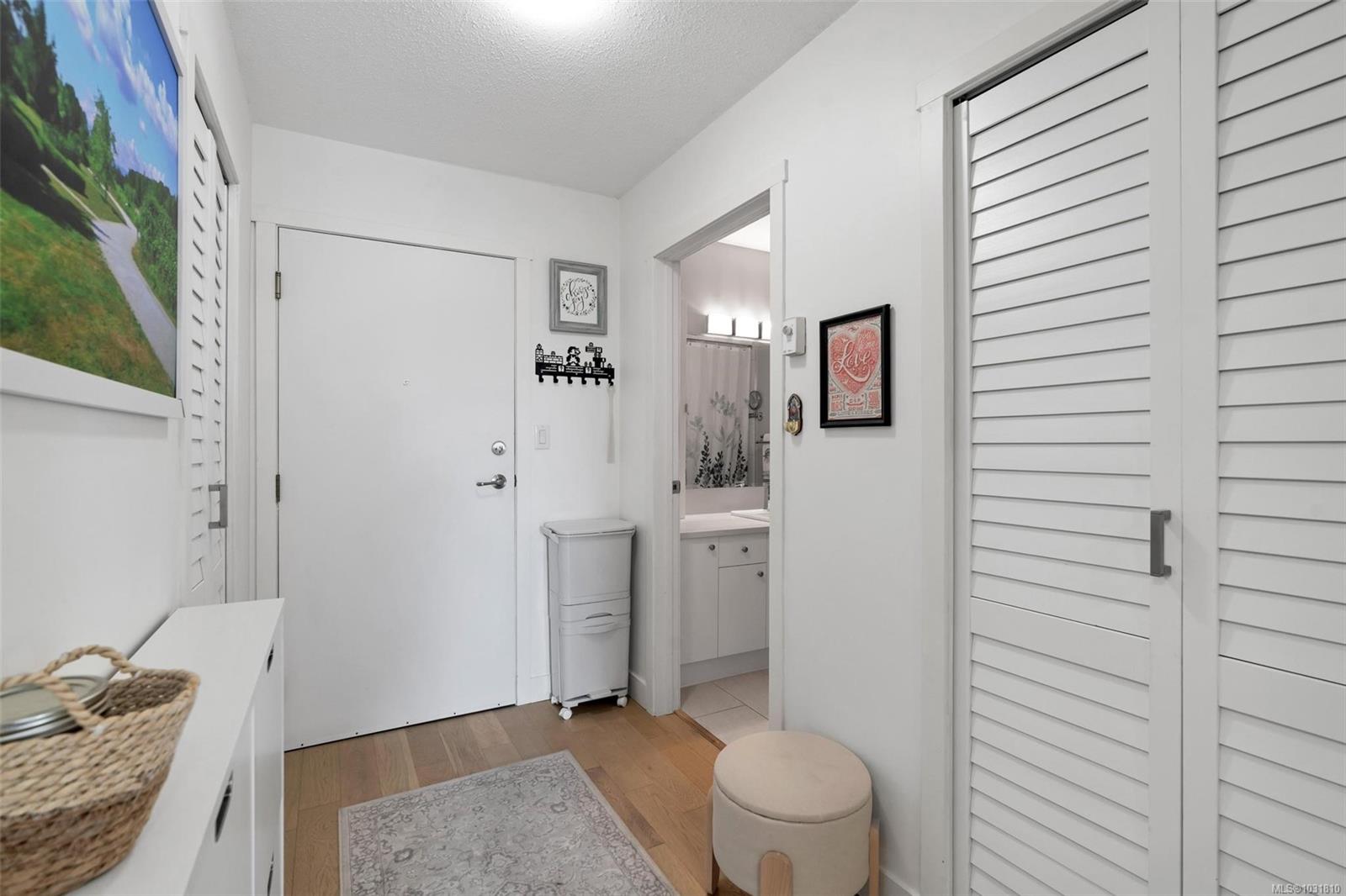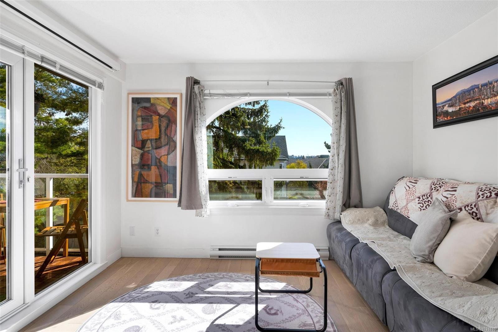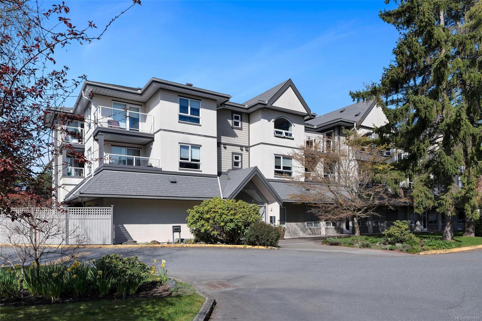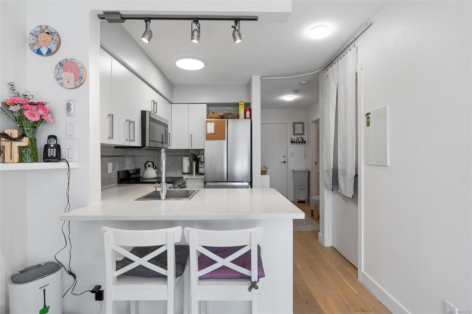Suite 304 at 2227 James White Boulevard in Sidney, BC is an updated top-floor 1-bedroom offering 558 sq ft with an efficient layout. A spacious foyer leads into the home, where engineered oak hardwood floors run throughout. The kitchen has been beautifully updated with stainless steel appliances, quartz countertops, an eating bar, and opens into a bright, airy living space. Large windows on two sides bring in plenty of natural light, creating a warm, inviting feel. Step onto your private 62 sq ft deck overlooking trees—perfect for quiet mornings. The bedroom fits a queen or king bed and includes built-in closet organizers. The bathroom features quartz counters, a new tub, and tile surround. Extras include in-suite laundry, a storage room, one parking stall, and a separate locker. With a Walk Score of 92, you're just steps to Beacon Avenue, the ocean, shops, dining, and all Sidney amenities. 3D walkthrough, floorpans and video tour are available.