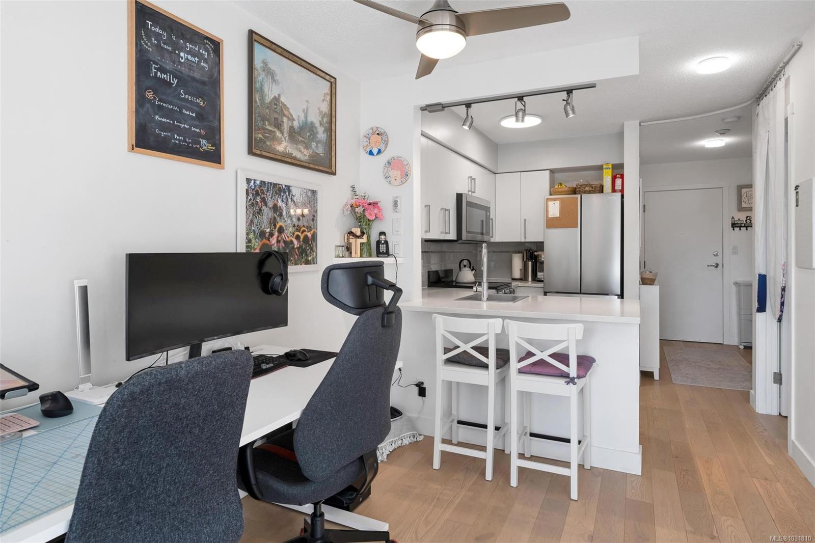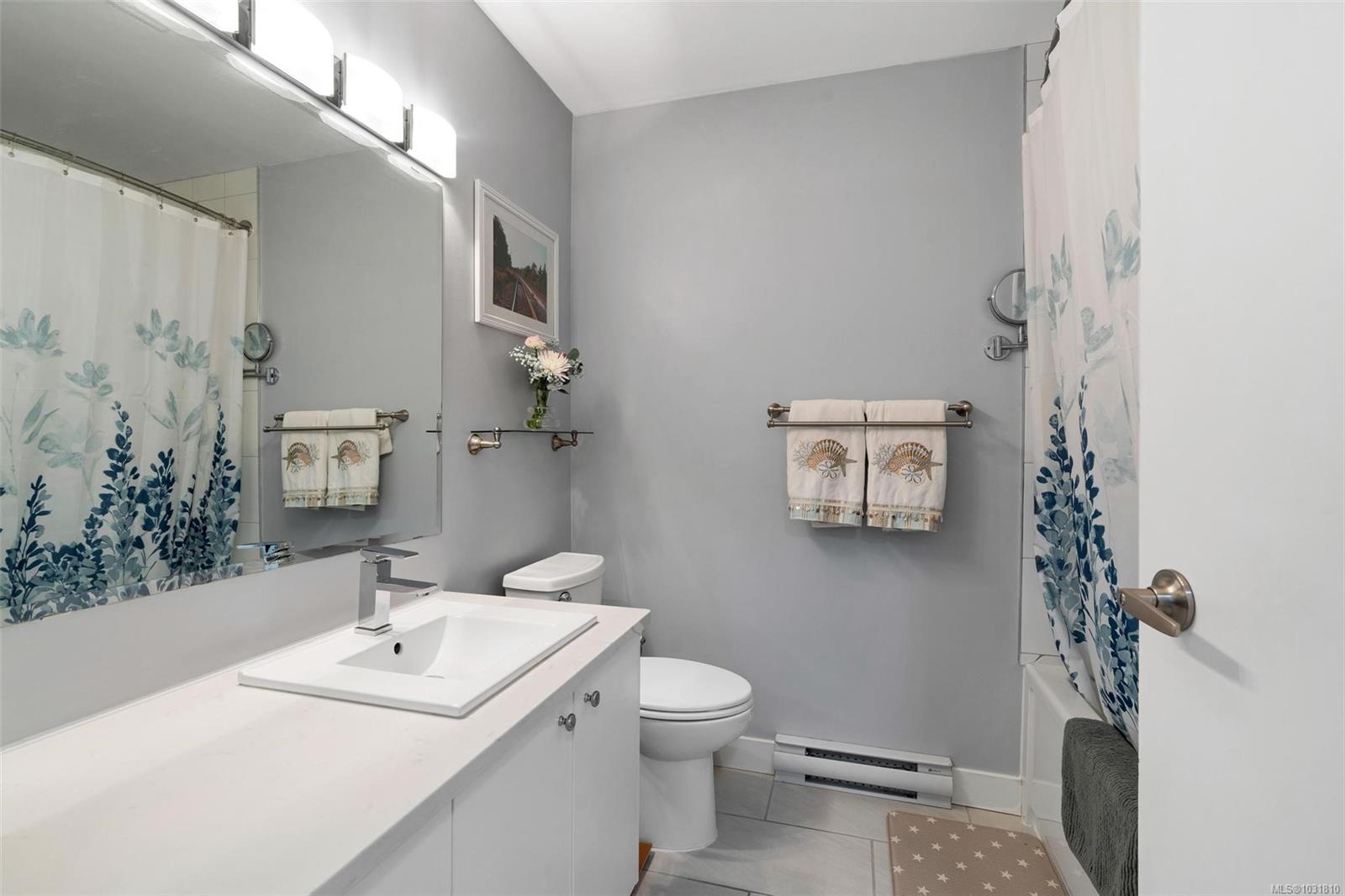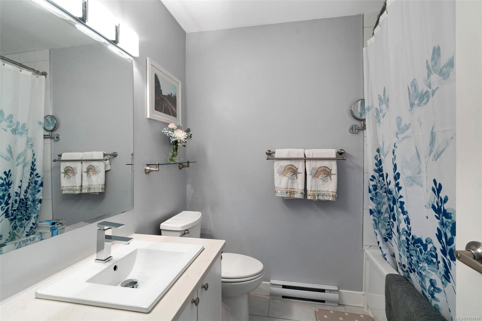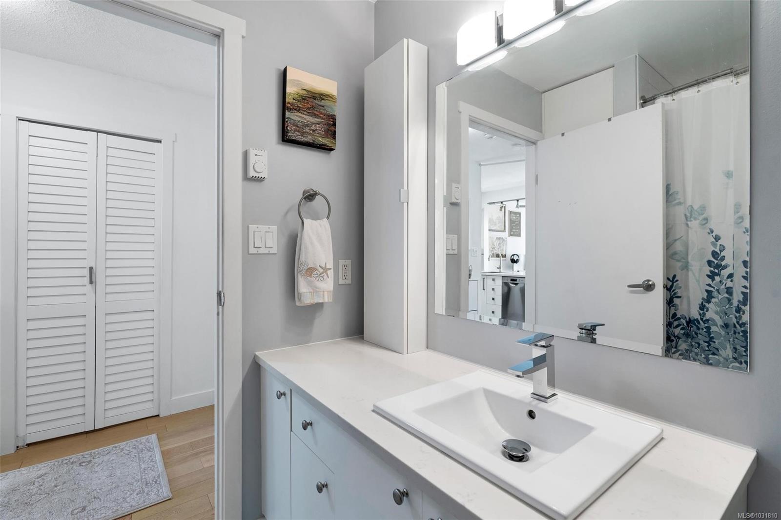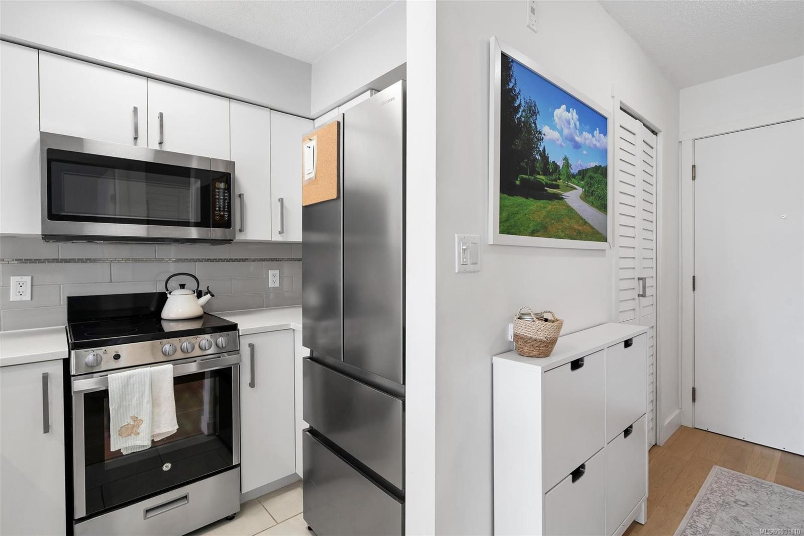 Suite 304 at 2227 James White Boulevard in Sidney, BC is an updated top-floor 1-bedroom offering 558 sq ft with an efficient layout. A spacious foyer leads into the home, where engineered oak hardwood floors run throughout. The kitchen has been beautifully updated with stainless steel appliances, quartz countertops, an eating bar, and opens into a bright, airy living space. Large windows on two sides bring in plenty of natural light, creating a warm, inviting feel. Step onto your private 62 sq ft deck overlooking trees—perfect for quiet mornings. The bedroom fits a queen or king bed and includes built-in closet organizers. The bathroom features quartz counters, a new tub, and tile surround. Extras include in-suite laundry, a storage room, one parking stall, and a separate locker. With a Walk Score of 92, you're just steps to Beacon Avenue, the ocean, shops, dining, and all Sidney amenities. 3D walkthrough, floorpans and video tour are available.